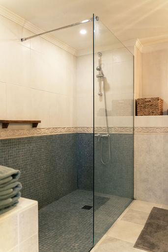 The bathroom has a spacious walk-in shower with towel warmer, lavatory and washbasin. Bath and hand towels are provided.